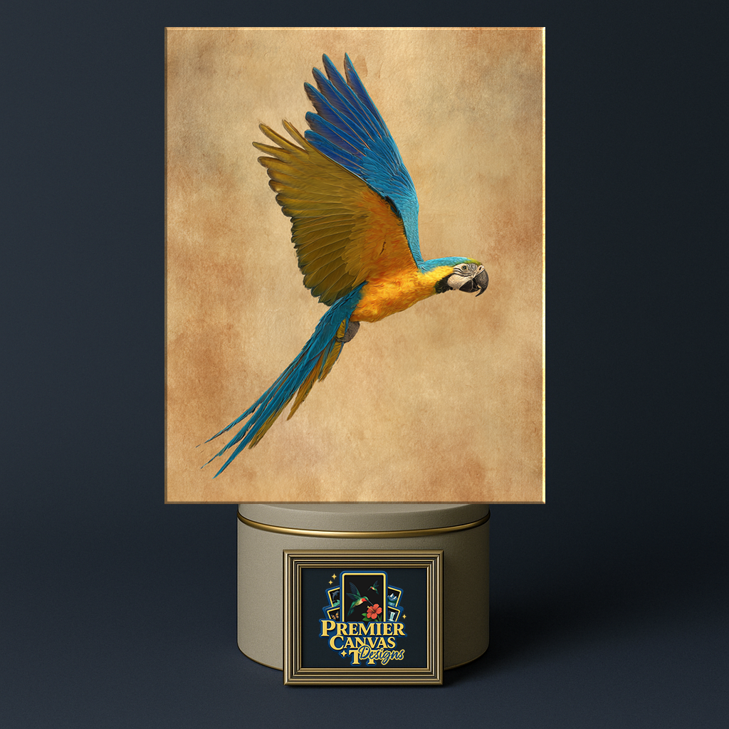 Sky Flight — a premium parrot fine art design with rich tropical color, crisp feather detail, and a soft studio-style background. Perfect for living rooms, offices, and gift-giving. Available in multiple sizes.
