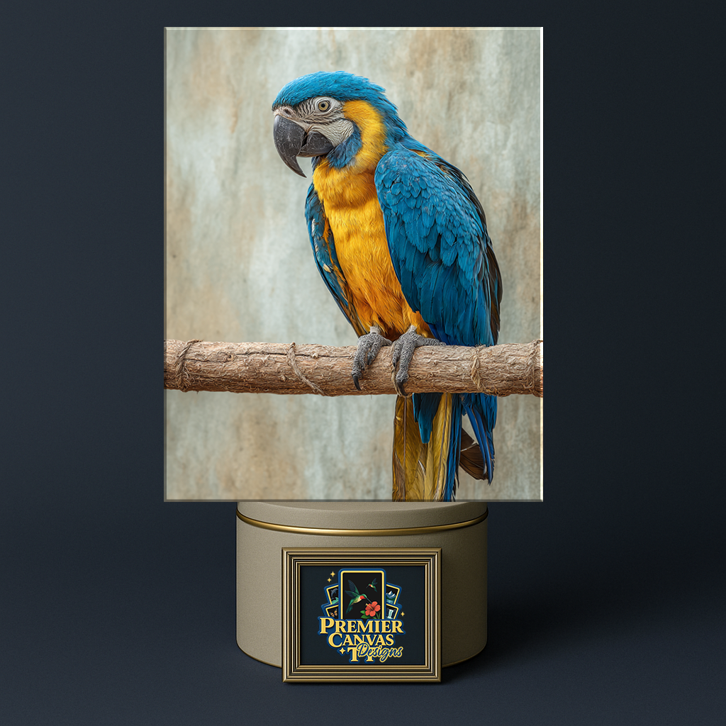 Perch Poise — a premium parrot fine art design with rich tropical color, crisp feather detail, and a soft studio-style background. Perfect for living rooms, offices, and gift-giving. Available in multiple sizes.