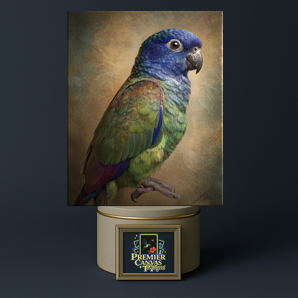 Branch Whisper — a premium parrot fine art design with rich tropical color, crisp feather detail, and a soft studio-style background. Perfect for living rooms, offices, and gift-giving. Available in multiple sizes.