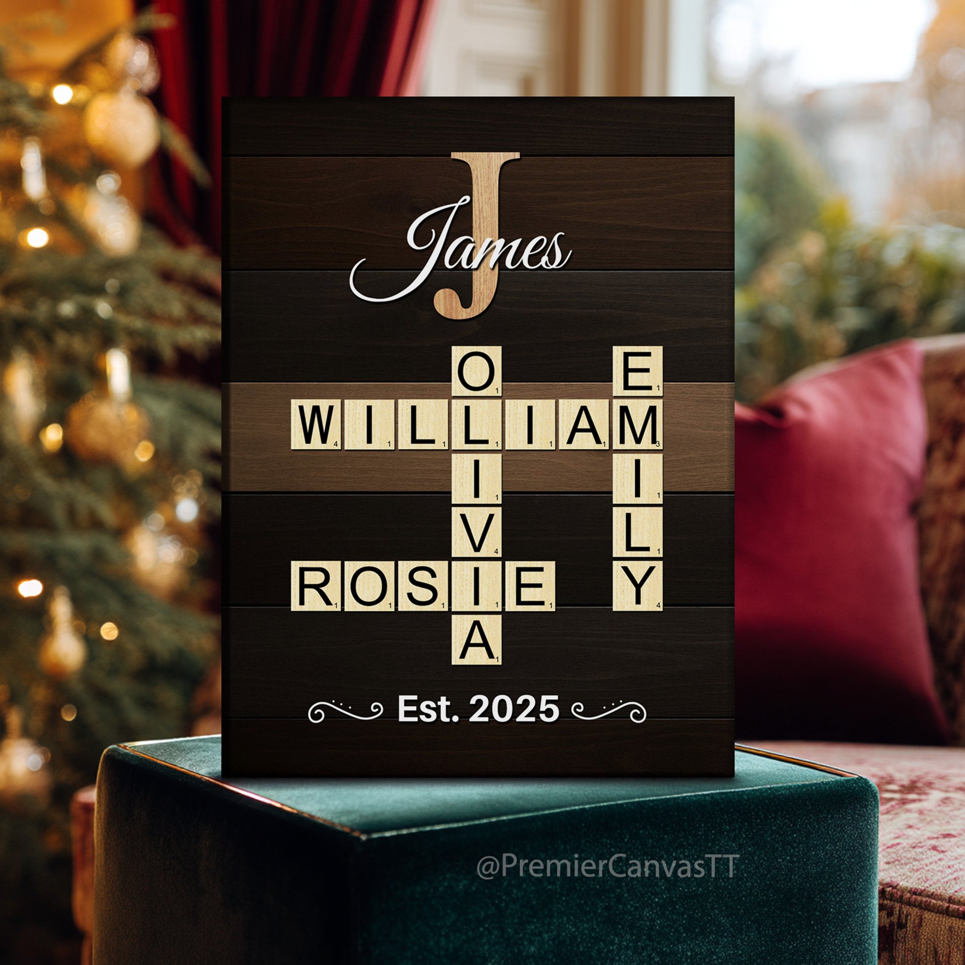 A bold and meaningful personalized crossword-style canvas featuring the names of loved ones arranged into a striking scrabble-inspired layout. Designed with a rich woodgrain background and elegant typography, this piece turns family names into powerful wall art.